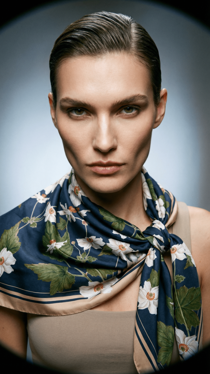 Scarf designs are created from Lyn Hathaway's hand-painted botanical artworks, and are designed in London by her daughter Sera Hathaway.