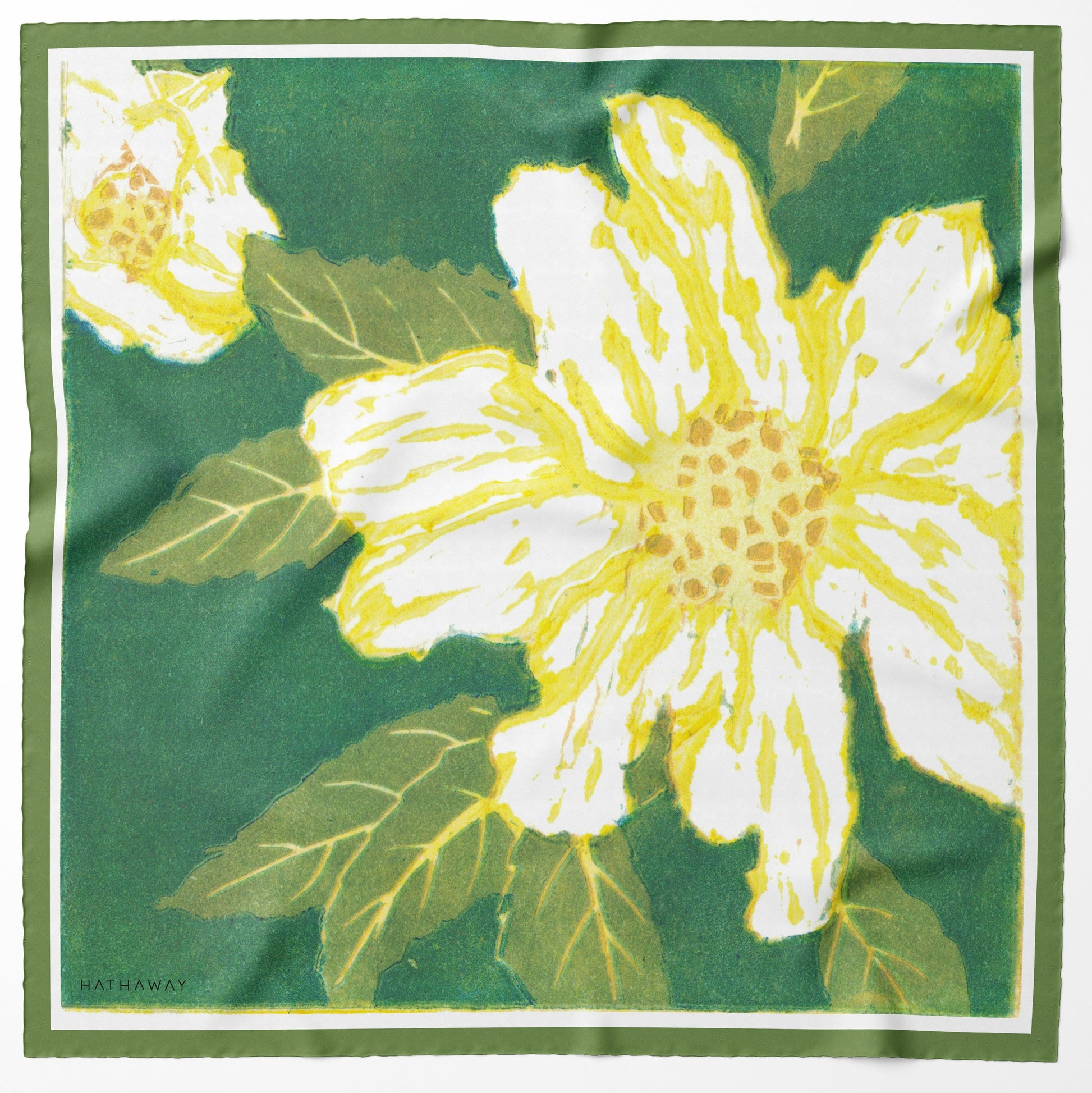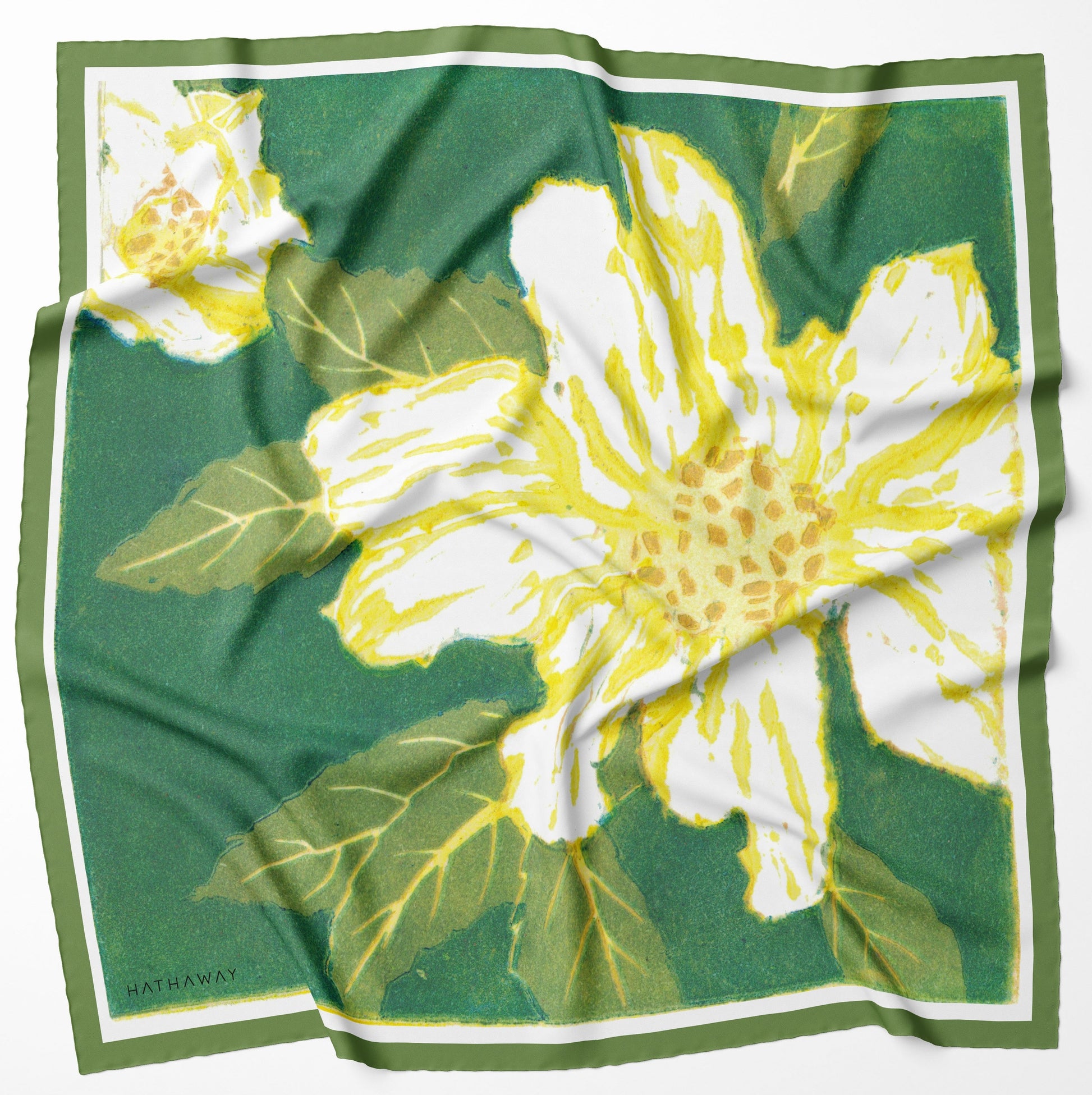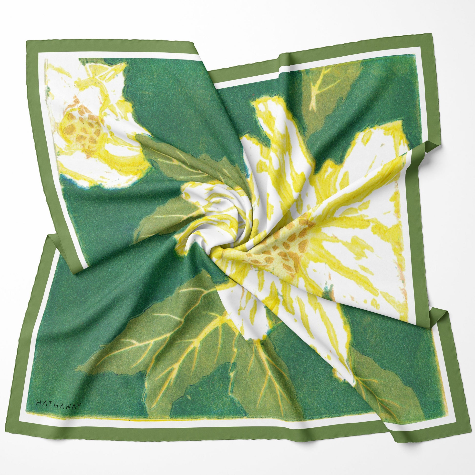 Scarf designs are created from Lyn Hathaway's hand-painted botanical artworks, and are designed in London by her daughter Sera Hathaway.