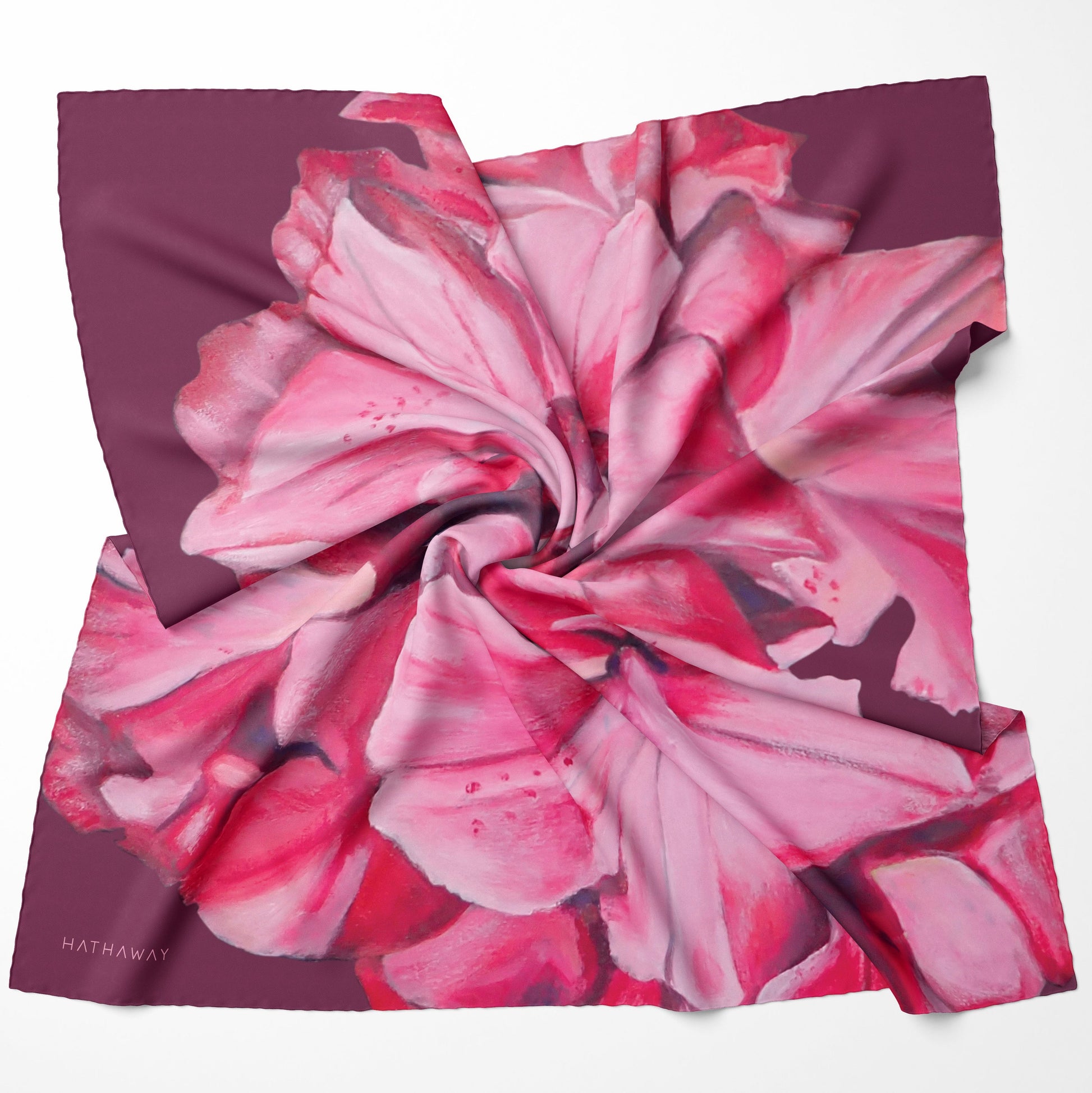Scarf designs are created from Lyn Hathaway's hand-painted botanical artworks, and are designed in London by her daughter Sera Hathaway.